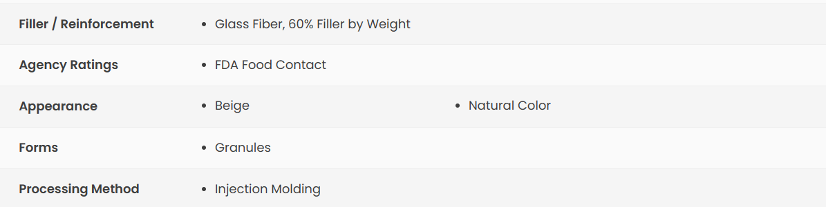 VICTREX 90GL60 is Applications where higher strength in a static system is required. Low coefficient of thermal expansion. Chemically resistant to aggressive environments, suitable for sterilization for medical and food contact applications.